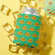 Graphic drawing, of bright-yellow hat with Sunflower blossoms, on brim, with orange trim-displayed against, a lime-green, background.