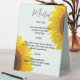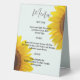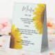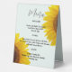 Sunflowers wedding menu sign for reception tables. Pale blue-green colour, this standing sign has text and design on both sides. “Menu” is the title, with a paragraph to list the food selections. Set on reception tables where all guests can see the menu offerings. Sunflowers are perfect for summer and fall events. They grow and bloom in summer and dry out in fall to feed the birds.