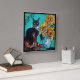 Expressive ,whimsical black cat ,colourful sunflowers and green leaves in yellow and turquoise blue colours. Artistic and vibrant original acrylic painting on wooden panel by Bulgan Lumini (c)