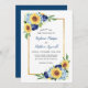 These wedding invitations feature a modern floral design with sunflowers, hydrangeas and navy blue roses with a faux gold border. Personalise them with your own text.