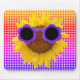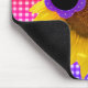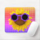 Yellow sunflower wearing purple polka dot sunglasses on a rainbow gingham background.