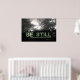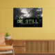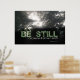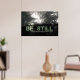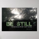 Be still and know that I am God poster with photo of sunlight shining through fog framed by trees.