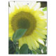 A bright and sunny photograph of a pale yellow sunflower in full bloom with the sunlight coming through the back of the petals. The foliage has varying shades of rich and light greens.