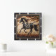 Bring the beauty of nature into your home with this stunning wall clock featuring a majestic black and white Paint horse trotting through a sunlit field. The clock is elegantly framed by a ½-inch flat black wooden border, showcasing deep carvings and rugged burn marks that add a unique, rustic charm. Crafted to simulate the look of real wood, this piece offers the warmth of natural textures without the maintenance, making it a perfect addition to any decor.