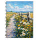 This artwork depicts a serene countryside path winding through a sunlit meadow filled with white daisies and golden wildflowers beside a rustic wooden fence. Painted in an expressive impressionist style with textured brushstrokes, it captures the warmth of summer, open skies, and peaceful rural charm. Soft blues, yellows, and greens create a calming, nostalgic mood, making this notebook perfect for journaling, notes, or creative writing inspired by nature and tranquility.