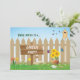 A sunny day is the perfect setting for a luncheon in the garden. Have your guests bring their greenest thumbs and swap seeds and gardening tips. Or just enjoy the view and have a tea party or cocktails at dusk. A backyard fence is shown with a wooden sign indicating the name of the event. It is surrounded by tulips, daffodils and sunflowers ready to plant . Butterflies and birds are caught flying around the scene with a birdhouse standing tall behind the fence. The reverse shows the tools of the trade including a shovel and gardening gloves next to a table being set for a fun get-together. Add customised text between the end of the fence and the table. Available with matching products.