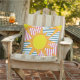 Sunny orange yellow suns white, teal pink stripes cushion