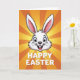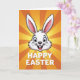 Designed with a cheerful digital illustration style, this Easter card features the close-up head of a cartoon rabbit with snowy white fur and bright blue eyes 🐰. The rabbit’s open smile shows two prominent front teeth, and its long upright ears have soft pink inner shading that frames the face in a friendly, affectionate way, like it’s leaning in for a warm hello. Behind the rabbit, a golden-yellow burst radiates outward into a deep sunny orange, creating a spotlight effect that feels like spring sunshine. The fur around the cheeks is lightly textured, adding a cuddly look against the smoother shapes of the face. Centered beneath the rabbit, a festive message appears in bright white letters with a faint shadow for depth, standing out clearly against the warm background 🌷. The overall layout keeps the character large and front-facing, with the text anchored below so your eyes move naturally from the smile to the greeting. The background shows a yellow-to-orange sunburst with rays spreading evenly from behind the rabbit’s head.