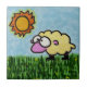 Funny little yellow sheep with a pink face, standing out in a field of dandelions, on a bright and sunny day. Original digital cartoon art by Taylor Addams. Ewe gonna love it!