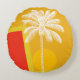Cheerful round pillow done in a yellow and orange abstract sunrise looking background, with graphics of a white palm tree outline. Customise to add any text you want.