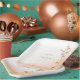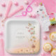This pretty wedding suite with it's warm sunset colour palette, handwritten script font and delicate wildflower arrangements has a timeless and sophisticated look that will impress your guests and help make your special day unforgettable. This striking paper plate, shown here on a gradient apricot to pink and white background, features an airy wildflower border and provides a template to easily add your names, wedding date and thank you message. Search ID1023 to see all the products in this wedding suite.