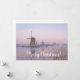 Christmas card with envelope of a fairy tale landscape with old windmills in the soft pastel light of a winter sunrise with ice on the river and frost on the reeds on a cold morning in Kinderdyke, the Netherlands with the text 'Merry Christmas!'.