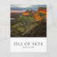 Photo postcard of the first rays of the sun shining on the mountains of Trotternish Ridge, Quiraing in a wilderness nature landscape on the Isle of Skye in Scotland, UK at sunset with a white box with the text 'Isle of Skye, Scotland' and some black thin lines.