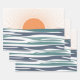 Abstract illustration of sunrise with orange sun and blue, white and turquoise sea waves decoration