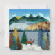 A beautiful landscape with unique colours and textures showing a mountain and lake landscape and multi-coloured forest with a rising sun and a moose in shades of blue, green, gold, and magenta.
