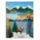 A beautiful landscape with unique colours and textures showing a mountain and lake landscape and multi-coloured forest with a rising sun and a moose in shades of blue, green, gold, and magenta.