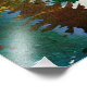 A beautiful landscape with unique colours and textures showing a mountain and lake landscape and multi-coloured forest with a rising sun and a moose in shades of blue, green, gold, and magenta.
