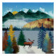 A beautiful landscape with unique colours and textures showing a mountain and lake landscape and multi-coloured forest with a rising sun and a moose in shades of blue, green, gold, and magenta.