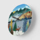 A beautiful landscape with unique colours and textures showing a mountain and lake landscape and multi-coloured forest with a rising sun and a moose in shades of blue, green, gold, and magenta.