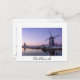 Postcard of the windmills of Kinderdijk along the canal during a purple sunrise in winter in Holland with a white border and the text: 'Holland'.