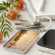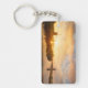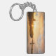 Photo keychain with a vibrant sunrise over a row of windmills and reflection in the water of the river on a beautiful morning in a countryside landscape in Kinderdijk in the Netherlands.