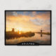 Photo postcard of a vibrant sunrise over a row of windmills and reflection in the water of the river on a beautiful morning in a countryside landscape in Kinderdijk in the Netherlands with a black edge and in white the text 'Holland'.