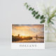 Photo postcard of a vibrant sunrise over a row of windmills and reflection in the water of the river on a beautiful morning in a countryside landscape in Kinderdijk in the Netherlands with a white edge and in a white box the text 'Holland'. It has stripes in red, white and blue, the colours of the dutch flag.