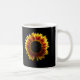 A mug with a photo of a sunflower that has a glow to it with a sunrise behind it.