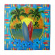 Beautiful beach sunset behind surfboards and palm trees, framed with bamboo and hibiscus flowers. With a pattern of retro surfboards background.