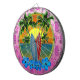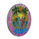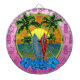 Beautiful beach sunset behind surfboards and palm trees, framed with bamboo and hibiscus flowers. With Hawaiian Honu Sea Turtles and Tiki Masks.