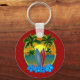 Beautiful beach sunset behind surfboards and palm trees, framed with bamboo and hibiscus flowers.
