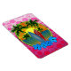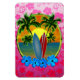 Beautiful beach sunset behind surfboards and palm trees, framed with bamboo and hibiscus flowers.With a pink background of Hawaiian Honu Sea Turtles and hibiscus flowers.