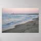 Pink sunset sky, blue water, waves and sand at Scusset Beach at Cape Cod Bay