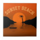 Retro orange and black tropical beach sunset art. Silhouettes of black mountains, palm tree and small boat reflected in the sea set against a bright orange sunset backdrop with optional text .