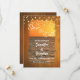 A beautiful beach at sunset is framed by rustic wood with the reflection of the sunset on it. String lights at the top provide an added glow. Brush script typography announces Save the Date. The upcoming wedding date details can easily be personalised.