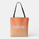 VIVIDLUXE Modern Casual Style. Inspired by a perfect beach sunset, this Tote Bag features a smooth gradient from deep orange to soft beige, evoking the warmth of the sand and the evening sky. The bold, modern typography adds a stylish 'BEACH VIBES' statement. Perfect for carrying your essentials to the shore, or for adding a touch of summer style anywhere you go.