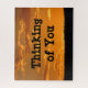 Give someone a challenge with this sunset photo puzzle. The landscape in silhouette appears at the bottom with the bright orange sky making up the majority of this photo. Long horizontal clouds are illuminated by the setting sun and provide a beautiful backdrop for "Thinking of You". The puzzle comes in a variety of sizes perfect for your gift giving needs.