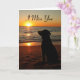A silhouette of a dog sits on a beach at sunset. The words I Miss You above her.