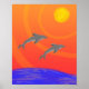 A pair of dolphins leap over a rolling wave - playing into the setting sun.
