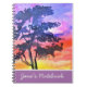 Beautiful colourful landscape sunset dreaming painting by artist Sacha Grossel of a red yellow and purple sunset landscape in the outback with a tree shadow in the foreground. Colourful original art in watercolor style.
