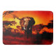 A bull elephant steps from the brush, bathed in the scarlet sunset.