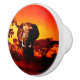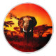 A bull elephant emerges from the brush, bathed in the scarlet sunset.