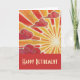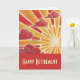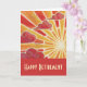 A gold and orange sun sets and the wind blows red and pink clouds across the sky. Greetings card with a gold, orange, red, pink and white customisable design for you to personalise with your own text, images and ideas. An original coloured pencil and metallic ink drawing by Jess Perry.