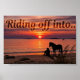 Capture the classic, romantic dream of riding off into the sunset. This beautiful poster features the silhouetted figure of a person sitting on a beach next to their horse, with the text "Riding off into..." above them in a graceful script. The background is a spectacular sunset over the water, with a perfectly mirrored reflection. This print is a perfect gift for horse lovers, dreamers, and anyone who appreciates a touch of Western romance and natural beauty.