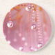 A 3D macro shot of a crystal chandelier. Myriads of strands of sparkling glass beads catch the light to create a lovely bokeh in the background. The blurred glass drops are reflected clearly in the sharply focused crystal balls in the foreground. The gold branches of the candelabra and soft pink atmosphere and lights give a sunset glow to the piece. Created in Vue.