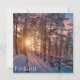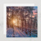 View of sunset in snowy pine forest with sun rays coming through and wooden path for relaxing walk. Covered in snow pine, fir and spruce trees. Winter forest