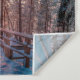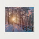 View of sunset in snowy pine forest with sun rays coming through and wooden path for relaxing walk. Covered in snow pine, fir and spruce trees. Winter forest