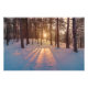 Sunset in winter snowy forest. Colorful sunset in coniferous forest with pine trees. Winter landscape.