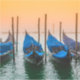 Peaceful setting next to the Doge's Palace in Venice, Italy, with four gondolas, all together pointing to a beautiful misty sunset.