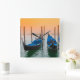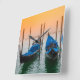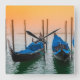 Peaceful setting next to the Doge's Palace in Venice, Italy, with four gondolas, all together pointing to a beautiful misty sunset.